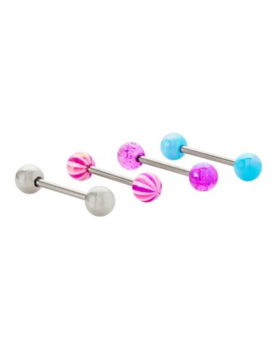 Includes: 4 Barbells Piercing type: Tongue Material: 316L surgical steel Gauge: Gauge / 1.6mm Length: 16mm External thread closure Jewelry care: Clean with antibacterial soap and warm water Piercing care: Clean with H2Ocean Aftercare Spray (sold separately) or saline solution Imported Note: Do not use any harsh, alcohol-based chemicals as this may cause tarnishing Note: Do not over-thread or apply excess pressure when adding/removing beads as breakage could occur Wear in healed piercings only. If irritation occurs, remove immediately Surgical steel may contain trace amounts of nickel This is a decorative item and should not be worn to sleep.