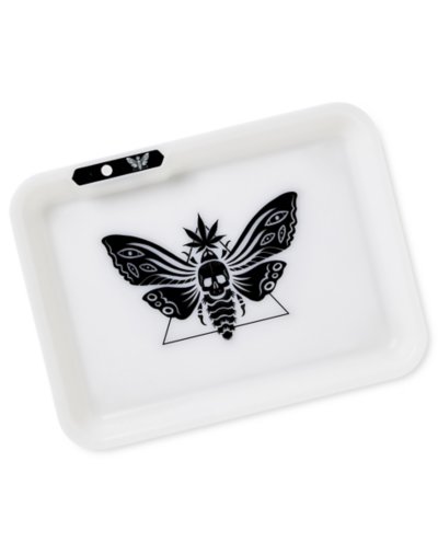 Losing your most essential items in the dark is the worst. Keep it rolling with this Light-Up LED Death Moth Tray. Add it to your smoker's lounge for the perfect flat surface! Dimensions: 8" H x 11" W x 1" D Material: Plastic Care: Spot clean Imported.