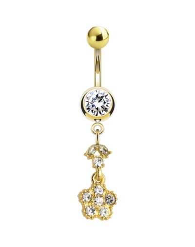 Round CZ Flower Goldtone Dangle Belly Ring - Gauge