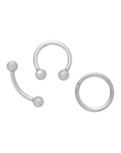 Includes: 1 Curved barbell 1 Horseshoe 1 Hinged hoop Piercing Type: Multiple Barbell Material: 316L surgical steel Gauge: gauge/1.2mm Interior Diameter: 8mm Exterior Diameter: 9.2mm Ball Size: 3mm Externally threaded closure Jewelry Care: Clean with antibacterial soap and warm water Piercing Care: Clean withH2Ocean Aftercare Spray(sold separately) or saline solution Imported Note: Do not use any harsh, alcohol-based chemicals as this may cause tarnishing Surgical steel may contain trace amounts of nickel Do not over-thread or apply excess pressure when.