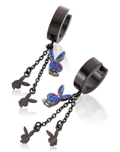 Buy Blue CZ Triple Playboy Bunny Chain Dangle Huggie Hoop Earrings for $24.99 at @ Spencersonline.com