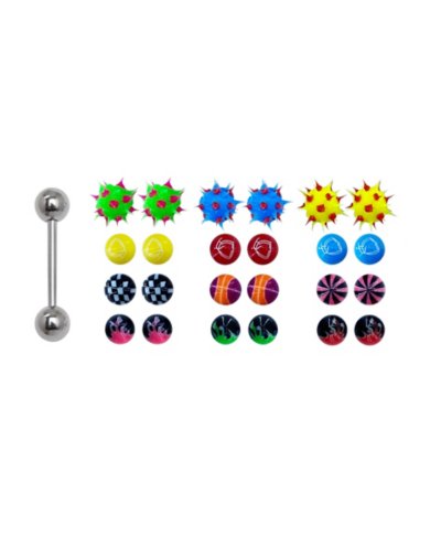 Exclusively at Spencer's Piercing Type: Multiple Barbell Material: 316L Surgical steel Accent Material: Acrylic Gauge: Gauge/1.6mm Length: 5/8" Ball Size: 6mm Threaded closure Jewelry Care: Clean with antibacterial soap and warm water Piercing Care: Clean with saline solution Imported Note: Do not use rubbing alcohol to clean jewelry. Normal alcohol consumption and/or mouthwash may accelerate wear and tear Do not over-thread or apply excess pressure when adding/removing beads as breakage could occur Surgical steel may contain trace amounts of nickel.