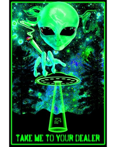 Hook an ET up with the good stuff when you decorate your room with the "Take Me to Your Dealer" Alien Black Light Poster. Dimensions H"x W": 24 x 36 Material: Paper Made in USA Printed in USA.
