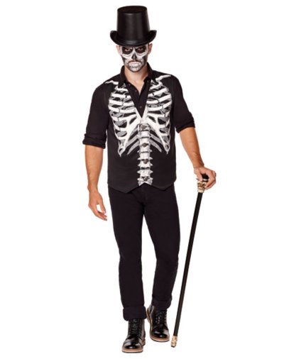 Add the perfect finishing touch to your skeleton costume with this terrifying top. When you put on this skeleton vest, the whole neighborhood will be horrified! V-neck Sleeveless Button closure Material: Polyester Care: Spot clean Imported.