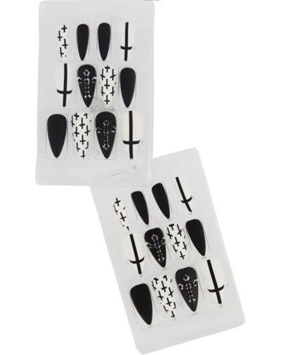 Add an unholy element to your costume this Halloween when you get these awesome press on nails! Elevate your style and spread fear this spooky szn. Includes: 24 press on nails Material: Plastic, adhesive Imported.