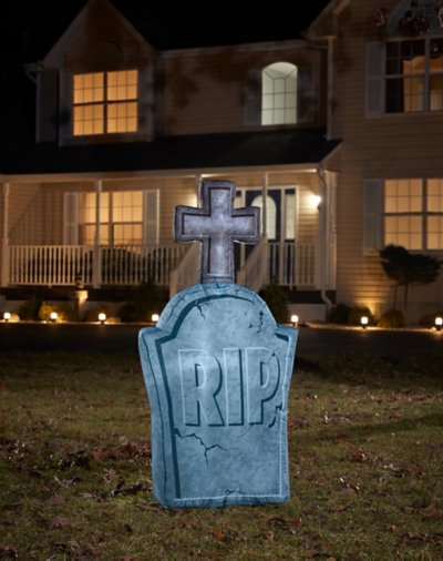 Turn your space into a spooky burial ground with this 4-foot-tall inflatable tombstone decoration! This inflatable tombstone features an ominous "RIP" on the front, an attached cross, and creepy crack graphics. Happy haunting! Includes: Inflatable with air fan Stakes Tethers Outdoor use Dimensions: 48" Material: Polyester, electrical wires Care: Spot clean Imported Note: Recommended for use in covered areas.