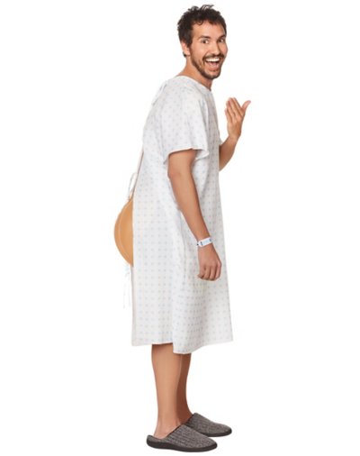 Time to go under the knife! Hop out of your hospital bed for some Halloween fun. Create your own character by slipping into the printed gown and accessorizing with the included hospital bracelet for an authentic look. Includes: Gown Bracelet Short sleeves Velcro closure Material: Polyester, plastic Care: Hand wash Imported Note: Socks, shoes, and fake buttocks prop sold separately.