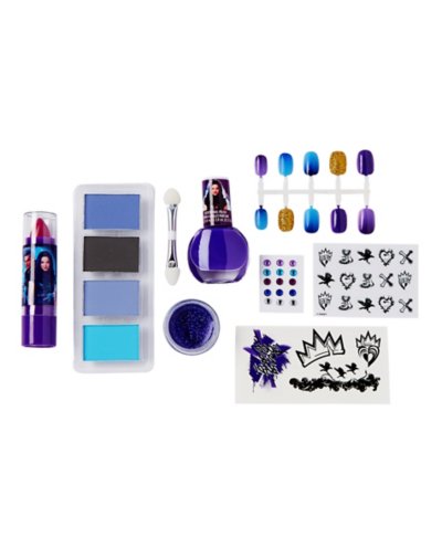 Your Halloween costume won't be complete without all of Mal's official looks! This kit includes press-on nails and the perfect eye shadow palette to top off your Descendants look. Officially licensed Includes: Eye shadow and brush Nailpolish Glitter gel Lipstick Temporary tattoos Press-on nails Gem stones Nail stickers Imported Note: Do not use on broken, blemished or sensitive skin. See packaging for more information.