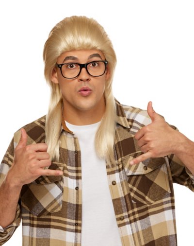 Even if this blond funny guy mullet wig makes up your entire costume, you're sure to make everyone laugh! This hilarious wig is the perfect way to show off your sense of humor. Material: Synthetic fibers Care: Hand wash with cool water and mild shampoo; air dry Imported.