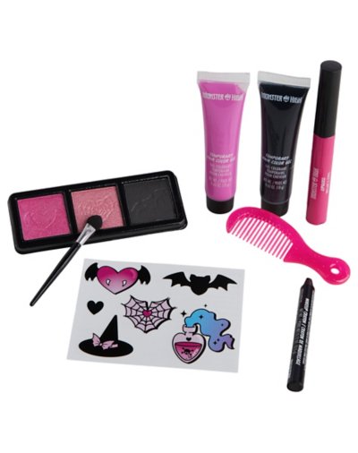 Freaky, fabulous, and FANGtastically friendly! Complete your Draculaura look with this officially licensedKids Draculaura Makeup Kit. This makeup kit includes a highlighter palette, lipgloss, temporary hair gel colors, makeup crayons, decals & more! Officially licensed Includes: 3 Highlighter palette Lipgloss 2 Temporary hair color gels Makeup crayon Mini comb 6 Decals Applicator Imported Note: Do not use on broken, blemished or sensitive skin. See packaging for more information.