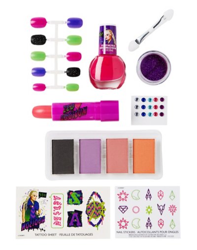 Fit right in at zombie high school when you use this officially licensed Zombies makeup kit. This zombies makeup kit will have you looking just like your favorite characters from the movie this Halloween. Officially licensed Includes: 4 Eyeshadow 1 Gemstone sheet Press on nails Glitter gel Nail polish Nail sticker sheet Tattoo sheet Brush Imported Note: Do not use on broken, blemished or sensitive skin. See packaging for more information.