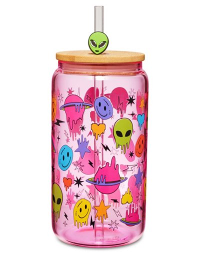 Stay hydrated all day long at work, school, or the gym when you bring along this Pink Alien Glass Cup with Straw. This cup features an out of this world pattern with aliens, stars and planets. Capacity: oz. Material: Glass Care: Gently hand wash only Imported.