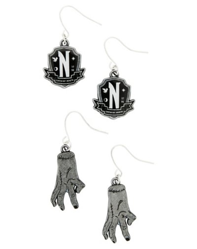 Welcome to Nevermore Academy! Make sure you stand out with this officially licensed Wednesday Addams earring set! Featuring 2 pairs of earrings with the Nevermore Academy crest and Thing! Officially licensed Includes 2 Earrings Material: Metal Post closure Care: spot clean Imported.