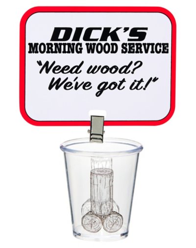 Need laughs this Halloween? Weve got it. Decorate any costume with this hilarious shot glass and name badge. This badge reads, Dicks Morning Wood Service. Need wood? Weve got it! Material: Plastic Care: Hand wash Imported.