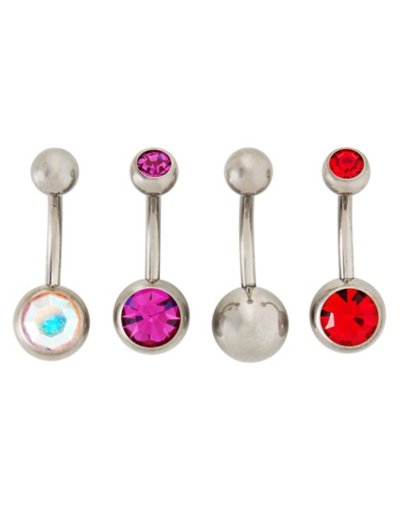 Includes: 4 Belly rings Piercing type: Belly Material: G23 Titanium Plating: Silver plated Gauge: Gauge / 1.6mm Length: 3/8" / 10mm Stone type: CZ Stone color: Aurora borealis, fuchsia, red External thread closure Jewelry care: Clean with antibacterial soap and warm water Piercing care: Clean with H2Ocean Aftercare Spray (sold separately) or saline solution Imported Note: Do not use any harsh, alcohol-based chemicals as this may cause tarnishing Note: Do not over-thread or apply excess pressure when adding/removing beads as breakage could occur Wear in healed piercings only. If irritation occurs, remove immediately This is a decorative item and should not be worn to sleep.