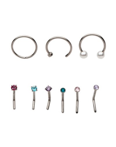 Includes: 3 Hoop Nose Rings 6 Nose L-Bends Piercing Type: Nostril Material: 316L surgical steel Silver-plated Gauge: gauge/0.8mm Stone type: Cubic zirconia Jewelry Care: Clean with antibacterial soap and warm water Piercing Care: Clean withH2Ocean Aftercare Spray(sold separately) or saline solution Imported Note: Do not use any harsh, alcohol-based chemicals as this may cause tarnishing Surgical steel may contain trace amounts of nickel Wear in healed piercings only. If irritation occurs, remove immediately This is a decorative item and should.