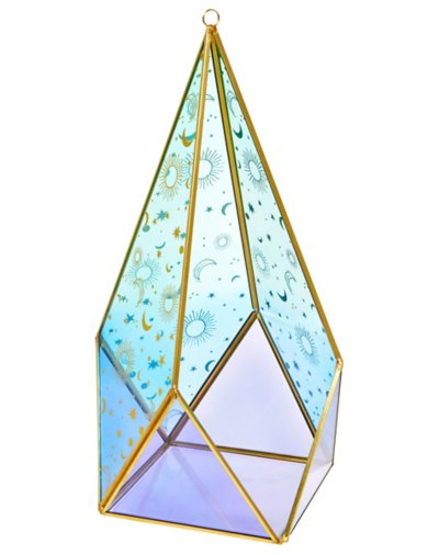 Light all your sances with this adorableCelestial Triangle Candle Holder. This glass candle holder features blue and purple stained glass with gold trim and a celestial pattern design perfect for any witch. Indoor use only Material: Glass Dimensions: 14.5" H x 6.25" W x 6.25" D Care: Spot clean Imported.