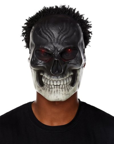 Terrorize everyone you encounter this Halloween when you wear this Light-Up Dark Skeleton Mask! With its glowing red eyes and giant teeth, this mask is sure to make them scream as you look your spookiest. Dimensions: 9.75" H x 6.5" W x 4" D Material: ABS Plastic Battery type: LR44 (1.5V lithium battery) Imported.