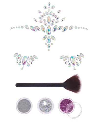 You'll have everything you need to look otherworldly and stylish with this Space Cowgirl Makeup Kit! This fun kit has three glitter gels and an adhesive gemstone decal for your face so you can transform yourself to look like you've beamed yourself here from another dimension with all its glamour. Includes: 3 glitter gels (0.1 oz) 1 adhesive face gemstone decal 1 applicator brush Ingredients: Glitter gel: Glycerin, polyethylene terephthalate, carbomer, trethanolamine. May contain: Yellow 5 Lake (CI 19140), Blue 1 Lake (CI 42090), Red 40 Lake (CI 16035), Red 28 Lake (CI 45410), titanium dioxide (CI 77891). Decal glue ingredients: Water, polymethyl methacrylate, phenoxyethanol, propylene glycol. Imported Note: Do not use on broken, blemished or sensitive skin. See packaging for more information.