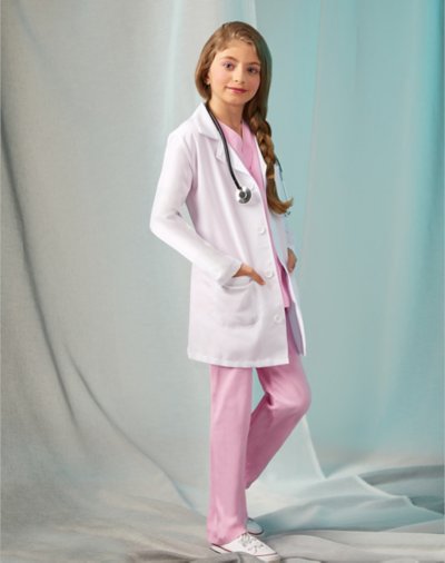 For career day at school or Halloween, this Doctor Girls Costume is perfect for your child to dress up and put Doctor before their name! This costume features"scrub" pants and shirt along with a white lab coat. Let your little doctor be comfortable and efficient in this adorable costume! Doctor Girls Costume includes: Shirt Pants Lab Coat Velcro Closure Materials: 100 % Polyester Wash/Care Instructions: Hand wash, Line Dry.