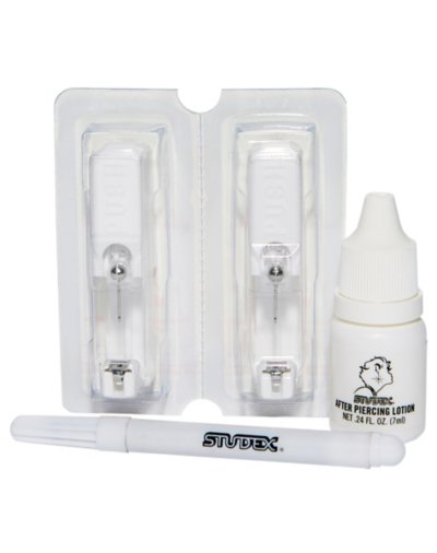 Get pierced ears at home with the Stainless Steel Ear Piercer Kit! This kit includes cleansing pads, a needle ear puncher, and a pair of stainless steel earrings specifically designed for piercing. Just cleanse the piercing site, make your mark, and pierce! Includes: Sterile, easy-to-use piercers Mini ear care solution Instructions for ear piercing and aftercare Surgical marking pen Alcohol prep pads Disposable gloves Piercing Type: Ear Barbell Material: 316L surgical steel Ball Size: 3mm Jewelry Care: Clean withantibacterial soap and warm water Piercing Care: Clean with H2Ocean Aftercare Spray (sold separately) or saline solution Imported Note: Do not use any harsh, alcohol-based chemicals as this may cause.