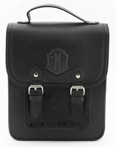 Step into the hauntingly magical world of Nevermore Academy this Halloween with our officially licensed Wednesday Addams Backpack! Adapted from Wednesday's very own bag from the Netflix hit series, its intricate raven designs and Nevermore crest will have you ready to embrace the macabre and channel your inner supernatural sleuth. Officially licensed Adjustable straps Strap length: Dimensions: 10" H x 8.8" W x 3.5" D 1 front magnetic snap pocket 1 inside slit pocket Magnestic snap closure Fully lined Material: Vegan leather, cotton Care: Spot clean Imported.