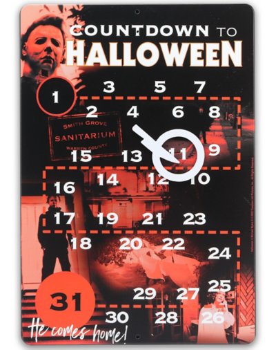 Only 31 more days left until Halloween! Count down the days until Michael Myers makes his return with this officially licensed Countdown to Halloween Sign. Any Michael Myers fan will love adding this Halloween themed countdown calendar to their home decor. Officially licensed Dimensions: 13" H x 9" W Material: Tin, polypropylene Care: Spot clean Imported.
