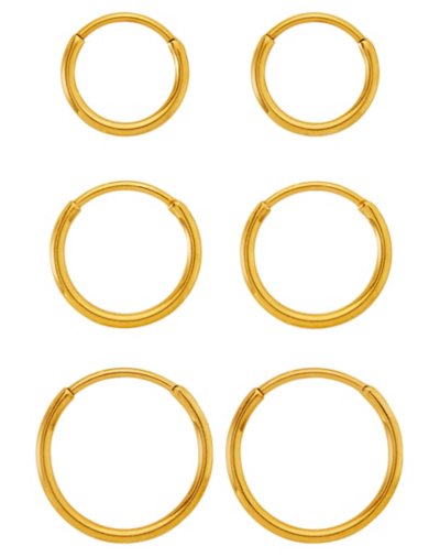 Includes: 3 Pairs of hoop earrings Exterior diameter: 10.4mm/12.4mm/14.4mm Interior diameter: 8mm/10mm/12mm Material: G23 Titanium Jewelry Care: Wipe clean or Spencer's Jewelry Wipes Imported Note: Do not use any harsh, alcohol-based chemicals as this may cause tarnishing This is a decorative item and should not be worn to sleep.