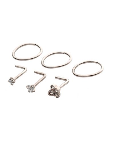 Includes: 3 Nose L-Bends 3 Nose hoops Piercing Type: Nostril Material: 316L surgical steel Gauge: gauge/0.8mm Stone Type: Cubic zirconia Jewelry Care: Clean with antibacterial soap and warm water Piercing Care: Clean with H2Ocean Aftercare Spray (sold separately) or saline solution Imported Note: Do not use any harsh, alcohol-based chemicals as this may cause tarnishing Surgical steel may contain trace amounts of nickel Wear in healed piercings only. If irritation occurs, remove immediately This is a decorative item and should not be worn to sleep.