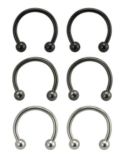Includes: 6 Horseshoe rings Piercing type: Multiple Available in multiple sizes Thickness: 1.29mm Length: 3/8" Threaded closure Jewelry Care: Clean with antibacterial soap and warm water Piercing Care: Clean with H2Ocean Aftercare Spray (sold separately) or saline solution Imported Note: Do not use any harsh, alcohol-based chemicals as this may cause tarnishing Do not over-thread or apply excess pressure when adding/removing beads as breakage could occur Surgical steel may contain trace amounts of nickel.