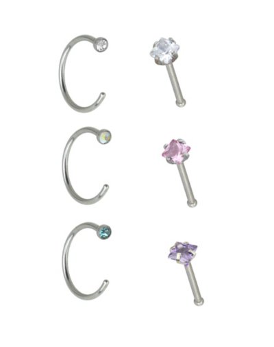 Includes: 3 Hoop nose rings 3 Bone nose rings Piercing Type: Nose Barbell Material: 316L Surgical steel Accent Material: Metal alloy Gauge: Gauge/0.8mm Length: 1/4"/6mm Stone Type: Cubic zirconia Ball Size: 3mm Jewelry Care: Clean with antibacterial soap and warm water Piercing Care: Clean with saline solution Imported Note: Do not use any harsh, alcohol-based chemicals as this may cause tarnishing Surgical steel may contain trace amounts of nickel.