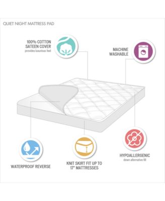 Worry less with the Madison Park Quiet Nights 100% Cotton Sateen Waterproof Down Alternative Mattress Pad. The 100% cotton sateen top creates a soft and luxurious feeling like your natural mattress, while the waterproof reverse provides a protective layer.