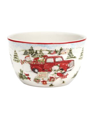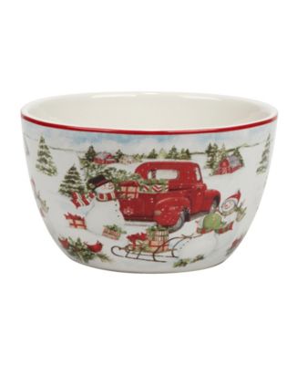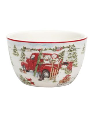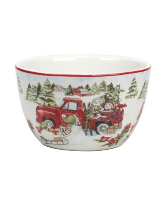 Celebrate the holiday season with Certified International's Red Truck Snowman serving or pasta bowl designed by artist Susan Winget. A snowy scene of smiling snowmen alongside a shiny red truck loaded with a holiday tree decorates this piece.