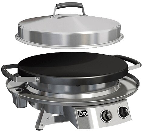 30" Professional Outdoor Portable Gas Flattop Griddle Tabletop with Two Temperature Zones, Seasoned Cook Surface, Battery Powered Ignitor, Quick Release Removable Cook Surface and Drip Pan: Liquid Propane. Two circular temperature zones: inner and outer surface. Variable temperatures 225F to 550F (121C to 288C). With LP Propane gas 48,000 BTUs. With Natural Gas 48,000 BTUs. Knobs separately control inner and outer burners. Electronic push button ignition. LP Propane gas standard, and Natural Gas option. Easy set-up on picnic or banquet table. Heat shield prevents heat from damaging table top. Stainless steel tank sleeve conceals gas tank. Quick release removable cook surface and drip pan. Cooking techniques: saut, braise, flattop (plancha) grilling, pan fry, roast, poach, steam, toast. Cooking surface is extremely durable and easy to clean. Stainless steel burners are protected against spill overs. Stainless steel drip pan surrounds cook surface with side mounted spill collection tray. Cooking Surface: 30" Diameter. Temperature Range: 225F to 550F (121C TO 288C). BTU Rate: 48,000. Weight: 117 lbs. Shipping Weight: 181 lbs. Height: 14". Width: 40". Depth: 40". Lid: Stainless Steel. Mounting Bracket: Included. Ignitor: Electronic Push Button. Removable Spill Over Trays: 2. Professional grill surface cleaning kit(3M brand): Includes handle, cook surface cleaning pad and screen. Stainless steel spatulas: 2. Stainless steel scraper: 1. Evo Color Illustrated Cookbook: 1.