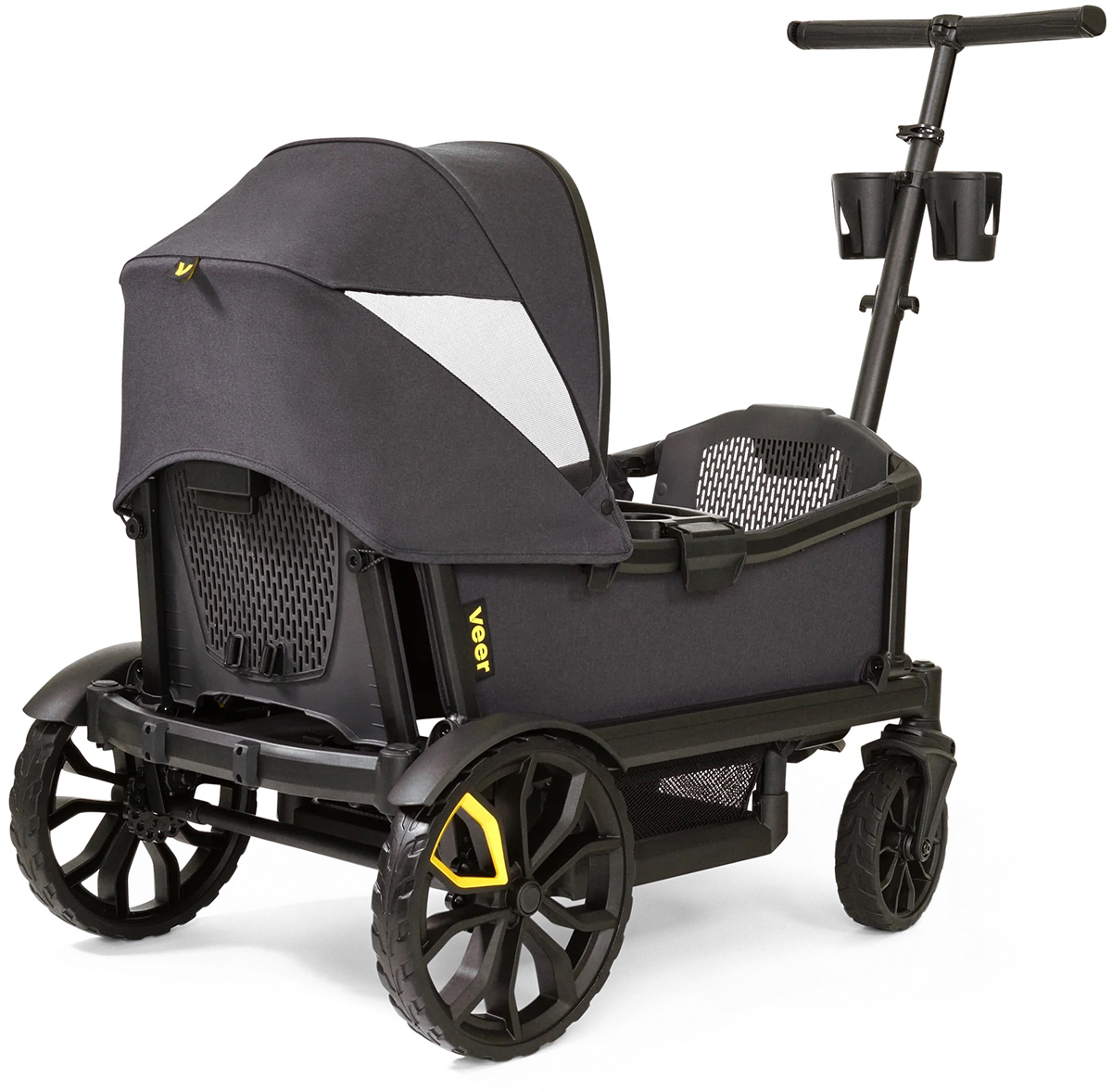A completely new concept, the Veer All-Terrain Cruiser is the first-ever crossover. It defies conventional labels by combining the functionality and safety of a premium stroller with the classic fun and practicality of a wagon. It is built to last for ages 0-5+ yrs and beyond. Cruiser can be pushed or pulled, or pulled alongside. It has two built in seats with 3-point harnesses for toddler comfort and safety, and a collapsible foot-well for ergonomic seating. It is maneuverable, adaptive, rugged, safe and mobile. A removable snack tray has two cup-holders built in, the sides have webbed pockets to hold necessities, and each seat has a built-in well for trinkets and snacks. Up to 6 cup holders can attach to keep refreshments in reach. At the end of a busy day, Veer can easily be hosed off, ready for the next adventure. It folds easily for compact storage and is self-standing. With optional accessories, the Cruiser can accommodate an infant car seat, 6 cup holders, two sunshades, and can convert to a bassinet! Extremely versatile and so fun to use, with larger tires and an innovative steering system, Cruiser was thoughtfully designed for any size family that prefers to blaze their own trail. Features Includes 2 Cup Holders and 1 Snack and Drink Tray.; Meets ASTM safety standards and is JPMA Certified; Push, pull or pull alongside; lockable handle for easy pushing; 2-contoured, vented passenger seats with 3-point safety harnesses; Accommodates an infant car seat (Adapter sold separately); Interior mesh storage pockets and molded-in cubby for drinks/snacks/toys; Front swivel wheels for exceptional maneuverability; Adjustable height handle; Easy to engage one-touch brake; Built in foot-well for comfort, collapsible for extra compact folding; Single-hand fold and self-standing; Quick-release wheels for extra small storage; Airplane-grade aluminum frame for strength and longevity; Precision engineered all-terrain suspension, frame & tires; Low friction bearings and large, knobby rear tires with fenders for all-terrain comfort; Veer Cruiser Sidewall Kit Change things up! Customize your Cruiser with Veer's new custom color Sidewall Kit. Change once or change often. The Sidewall Kit easily installs on any Veer Cruiser or Cruiser XL and is made from the same rugged, washable material as our original Veer sidewalls. The kit includes two sidewalls and two coordinating wheel inserts that replace your standard yellow wheel inserts. Veer Retractable Canopy The Retractable Canopy for Cruiser quickly and intuitively clips onto Cruiser's frame and easily extends up and down. One or two can be attached, above either seat. A peak-a-boo window allows you to see your precious cargo and discreet, hidden magnets hold the window in the up position. Canopy works with Nap System to create the perfect rest stop for young ones, or with Bug Shield to add insect protection. A zip-on visor is available for extended coverage. Add a Pop of color or coordinate with Veer's standard Heather Gray color. Veer Cruiser Stroller Wagon + Sidewall + Canopy Kit includes: Cruiser Wagon; 2 Cup Holders; Snack Tray; 2 Sidewalls right and left panels; 2 Coordinating wheel inserts; 1 Canopy; Specifications Product dimensions: 37 L x 20 W x 25 H; Folded dimensions: 37 L x 20 W x 14 H; Weight: 32.5 lb; Suitability: Children 0-5+ years; Capacity:Max weight: 55 lbs/seat;.