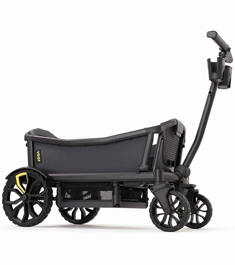 A completely new concept, the Veer All-Terrain Cruiser is the first-ever crossover. It defies conventional labels by combining the functionality and safety of a premium stroller with the classic fun and practicality of a wagon. It is built to last for ages 0-5+ yrs and beyond. Cruiser can be pushed or pulled, or pulled alongside. It has two built in seats with 3-point harnesses for toddler comfort and safety, and a collapsible foot-well for ergonomic seating. It is maneuverable, adaptive, rugged, safe and mobile. A removable snack tray has two cup-holders built in, the sides have webbed pockets to hold necessities, and each seat has a built-in well for trinkets and snacks. Up to 6 cup holders can attach to keep refreshments in reach. At the end of a busy day, Veer can easily be hosed off, ready for the next adventure. It folds easily for compact storage and is self-standing. With optional accessories, the Cruiser can accommodate an infant car seat, 6 cup holders, two sunshades, and can convert to a bassinet! Extremely versatile and so fun to use, with larger tires and an innovative steering system, Cruiser was thoughtfully designed for any size family that prefers to blaze their own trail. Features Includes 2 Cup Holders and 1 Snack and Drink Tray.; Meets ASTM safety standards and is JPMA Certified; Push, pull or pull alongside; lockable handle for easy pushing; 2-contoured, vented passenger seats with 3-point safety harnesses; Accommodates an infant car seat (Adapter sold separately); Interior mesh storage pockets and molded-in cubby for drinks/snacks/toys; Front swivel wheels for exceptional maneuverability; Adjustable height handle; Easy to engage one-touch brake; Built in foot-well for comfort, collapsible for extra compact folding; Single-hand fold and self-standing; Quick-release wheels for extra small storage; Airplane-grade aluminum frame for strength and longevity; Precision engineered all-terrain suspension, frame & tires; Low friction bearings and large, knobby rear tires with fenders for all-terrain comfort; Veer Cruiser Stroller Wagon includes: Cruiser Wagon; 2 Cup Holders; Snack Tray; Specifications Product dimensions: 37 L x 20 W x 25 H; Folded dimensions: 37 L x 20 W x 14 H; Weight: 32.5 lb; Suitability: Children 0-5+ years; Capacity:Max weight: 55 lbs/seat;.