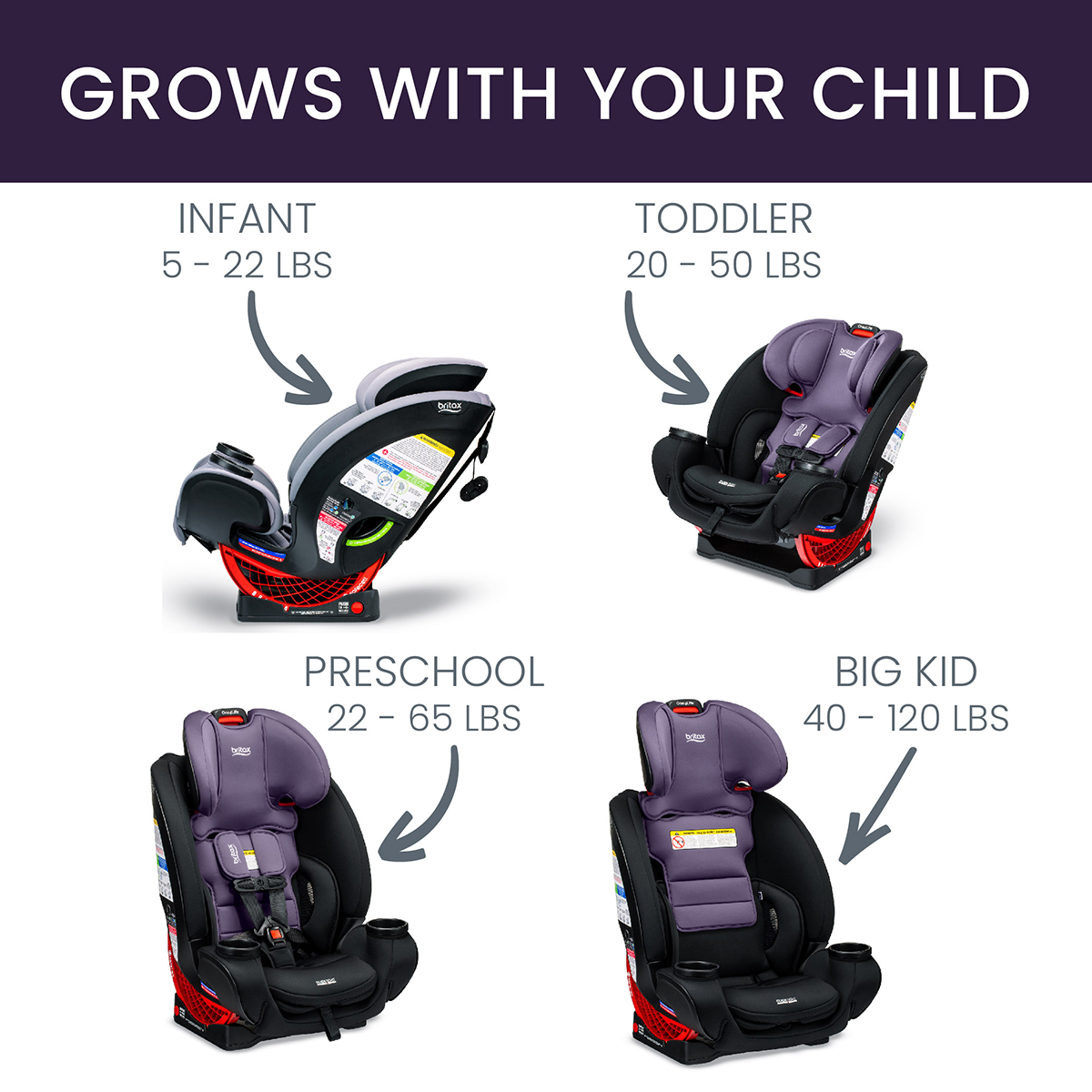 One4Life takes your child from birth to big kid with Britax Safety and ClickTight Installation. It easily converts from a rear-facing infant car seat, to a forward-facing 5-point harness, to a high-back belt-positioning booster seat. SafeWash cover is safe to machine wash and dry. ClickTight is as easy as buckling a seat belt, so you can install with confidence, every time. Color-coded belt paths show you where to route the seat belt for each installation mode. Plus, easy-read indicators help you find the correct recline angle. A high strength steel frame, crumple zone, and V-shaped tether help absorb crash energy. And, 2 layers of side impact protection surround your child's head, neck and torso. As your baby grows, adjust the 15-position headrest & harness in seconds to create the perfect fit. When it's time for booster mode, simply tuck the harness into the built-in storage compartment. With cooling channels, premium padding and built-in arm rests, your child will love the ride. Features: Converts from a rear-facing infant seat (5- 50lb) to a forward-facing 5-point harness seat (22-65 lbs) to a high-back belt-positioning booster seat (40- 120lb).; 10 years of use: One4Life convertible to booster car seat grows with your child from 5 120 lbs and up to 63" in height; ClickTight Installation. Install with confidence, every time. You'll know it's right in just 3 easy steps: Pinch to open. Thread & buckle. Click it closed.; 15-Position, Quick-Adjust Headrest & Harness create the proper fit as your child grows.; Patented V-Shaped Tether with staged-release stitches helps slow and reduce forward movement during a crash.; High Strength Steel Frame reinforces the seat structure to help keep it sturdy and stabilized.; Quick-Push, 9-Position Recline helps you find the most comfortable fit for your child and the best fit for your vehicle.; Rear-facing with infant positioning pillow mode: 5 lbs - 22 lbs; Rear-facing mode: 23 lbs - 40 lbs; Forward-facing mode: 20 lbs - 65 lbs.; 2 Layers of Side Impact Protection: energy-absorbing shell and foam-lined headrest surround your child's head, neck, and torso; SafeCell Technology acts as a crumple zone, absorbing crash energy to help keep it away from your child; High Strength Steel Frame reinforces the seat structure to help keep it stabilized; V-Shaped Tether with staged-release stiches helps slow and reduce forward movement in a crash; Quick-push LATCH connectors lock into place with a click, and are easily released with the push of a button; Built-in lock-offs make seat belt installation a breeze; Easy-Read Level Indicators help you find the correct recline angle for your vehicle; 10-Position Harness & Headrest easily adjust to grow with your baby; Clicktight Installation: Britax's commitment to child safety inspired one of their proudest innovations to date - ClickTight Installation. They knew something had to be done about the staggering number of car seats being installed incorrectly. Despite best efforts, parents were still getting it wrong. So Britax developed a 3-step, self-tensioning system that makes it easy to achieve secure installation, every time. Specifications: Product Dimensions: 20.5" L x 19.5" W x 25" H; Car Seat Weight: 30 lbs; Child Weight Capacity: Rear-facing: 5- 50 lbs; Forward-facing: 22-65 lbs; Booster seat: 40- 120 lbs; ; Child Height Capacity: Up to 63";.