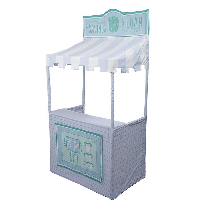 This easy to assemble play stand can transform any little entrepreneur's imagination into serious business! Plastic poles covered by high quality poly/cotton canvas sets the stage for a Drive Thru Burger Shop, a Drive-Up ATM, or a corner Lemonade Stand. Materials: Polyester & plastic Dimensions: 32 x 20 x 60 inches Weight: 7 lbs.
