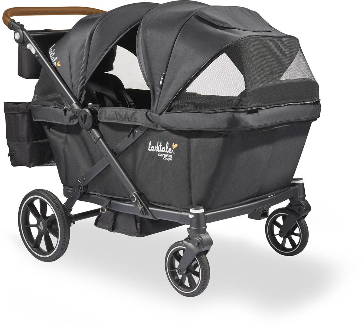 The Larktale caravan coupe Quad offers all the features of a large stroller/wagon, in a more nimble and compact package with an impressively small fold, all while maintaining the comfortable seating and higher weight capacity you crave for your growing kiddos. Suitable for children from 6 months to 48.5 lbs per seat, the caravan coupe will comfortably seat up to four growing kids with reclining seat backs and a shared drop-down footwell for comfortable stroller-style seating. The unique no-rethread harness system can be reconfigured to seat either one or two passengers per side and the roomy interior can safely accommodate a newborn using a caravan quad car seat adapter (sold separately). If you need space to haul cargo or let your little ones stretch their legs, you can securely invert the footwell to create a flat base interior to suit your needs. No tools are needed to complete the transition, making it easy for parents to change their strolling style on the fly. Parents will also love the dual adjustable sun canopies with air-flow panel and peek-a-boo window, seat recline, height-adjustable leatherette handlebar, included stroller organizer and self-leveling cup holder, and the all-wheel suspension system. The impressively compact fold of the caravan coupe Quad is a game changer for multi-kid families that need a stroller/wagon but are short on vehicle trunk space, or storage space in their homes. Features Suitable from 6 months to 48.5 lbs per seat and 215 lbs total weight capacity including cargo.; Compact design without compromising on features!; Quick and easy fold that tucks the rear wheels inwards for an unexpectedly compact folded footprint. Clipthe fold lock to keep the frame folded for transportation or storage.; Dual multi-position sun canopies each feature a zippered canopy extension with airflow panel, and a peek-a-boo window.; An adjustable handlebar with leatherette grip provides a comfortable push for users of varying heights.; The seatback on each side can be reclined individually for your passengers' comfort.; No-rethread padded safety harnesses offer easy height adjustments and can be reconfigured to seat one ortwo children per side.; The large storage basket can be attached to either the front or the rear of the wagon.; Drop-down footwell allows children a more natural seating position.; Adaptable interior allows you to securely invert the footwell to create a flat seating position for cargo or tolet passengers stretch their legs.; Handlebar console with multiple storage compartments for drinks and personal items.; Storage console for snacks and toys can be mounted between the seats or on the exterior of the wagon.; Four mesh interior pockets keep your child's snacks and toys within their reach.; Exterior seat back mesh pocket to store on-the-go essentials.; Large non-flat rubber wheels and an all-wheel suspension system provide a smooth and comfortable ride.; Lockable swivel front wheels provide extra stability on uneven terrain.; Self-leveling cup holder included.; Clear-view non-fogging deluxe rain cover included.; Safely attach an infant car seat using a caravan coupe Quad car seat adapter (sold separately); Spot clean or remove fabric completely to hand-wash in mild detergent. Replace fabric on frame to air drycompletely before use after washing.; Specifications Age Range: Suitable from 6 months up to 48.5 lbs per seat; Total Weight Capacity: 215 lbs; Newborn Options: Car Seat Adapter available for Maxi Cosi, Clek and Nuna infant seats; Assembled Dimensions: 49.5 x 30 x 42.5 inches; Folded Dimensions: 38.5 x 30 x 18 inches; Assembled Product Weight: 54.3 lbs; Adjustable Handlebar Range: 28 43 inches; Packaged Dimensions: 27.25 x 11.5 x 37.5 inches; Packaged Weight: 60.2 lbs; What's In The Box Stroller/Wagon Chassis; Sun Canopies; Stroller Organizer; Storage Console; Storage Basket; Cup Holder; Rain Cover;.