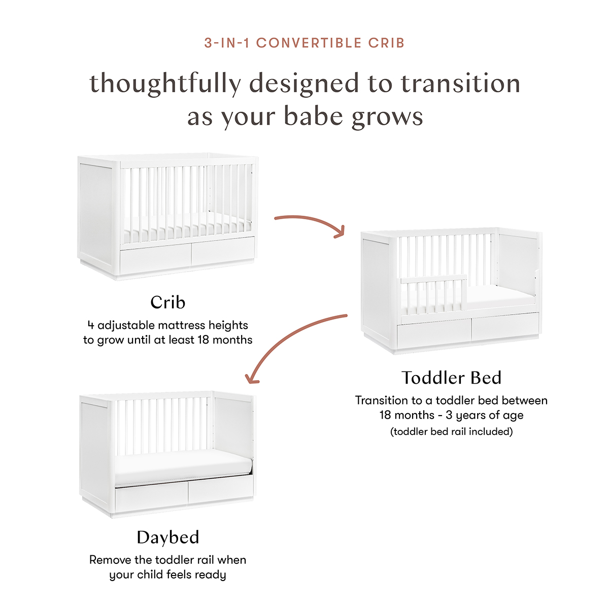 The Bento 3-in-1 Convertible Storage Crib celebrates modern minimalism with softly curved edges, hidden drawer pulls, and raised platform base. It's the thoughtful details that set this crib apart with two under-crib storage drawers and included toddler bed conversion kit. Made with sustainable New Zealand pine wood and screened for harmful chemical emissions to ensure it meets GREENGUARD GOLD Certification. Features CLEAN MODERN LINES: Smart and stylish modern storage crib with two separate drawers featuring hidden drawer pulls, softly curved edges and a raised platform base; GREENGUARD GOLD CERTIFIED: The Bento has been tested for over 10,000 chemical emissions and VOCs, undergoing rigorous scientific testing to meet some of the world's most stringent chemical emissions requirements. It contributes to cleaner indoor air, creating a healthier environment for your baby to sleep, play, and grow; 3-IN-1 CONVERTABILITY & ADJUSTABLE MATTRESS HEIGHT: Transitions from crib to toddler bed and daybed, with an included toddler bed conversion kit. The low profile design and 4 adjustable mattress positions make it easy to put a newborn to rest; STORAGE DRAWERS: There's no such thing as too much storage space! Includes two separate under-crib storage drawers with hidden drawer pulls for those extra sheets and blankets; SUSTAINABLE DESIGN: Made with sustainably sourced solid New Zealand pine wood and TSCA compliant engineered wood side panels. Hidden hardware construction eliminates visible screws on the furniture exterior for a polished, clean look; SAFE FOR BABE: We go the extra step to ensure your babe's safety. Finished in a non-toxic multi-step painting and staining process that is lead and phthalate safe which exceeds ASTM International and U.S. CPSC safety standards; UNIVERSAL MATTRESS FIT: The Bento is a standard size crib, we recommend our Pure by babyletto line of hypoallergenic and eco-conscious crib mattresses (52" x 27.75"); COMPLETE YOUR NURSERY: Shop the full Bento Collection with a matching Bento 6-Drawer Assembled Dresser or 3-Drawer Changer Dresser; Specifications Made in Taiwan (R.O.C.); Assembled Dimensions: 53.5"L x 29.5"W x 36"H; Assembled Weight: 85lbs; Slat Strength: 135 lbs; Front Rail to Floor Height: 35.75"; Interior Crib Measurements: 52"L x 28"W; MAXIMUM WEIGHT: 50 lbs;.