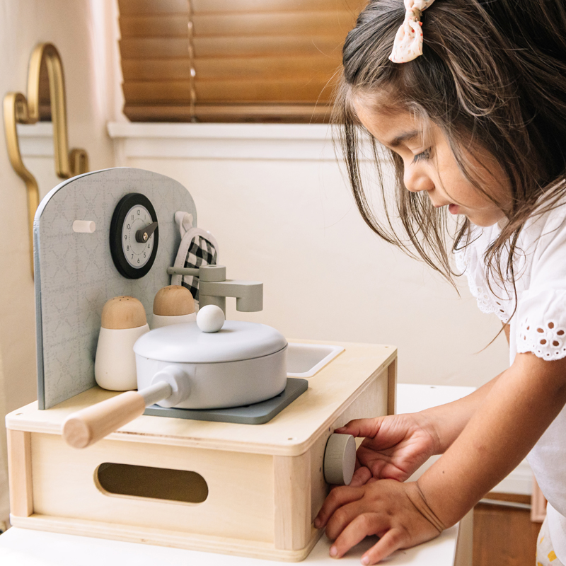 Let's lay it all our on the table-with our Table it Kitchen. Our sweet little wooden kitchen comes complete with salt and pepper shakers, pot holder, spatula, and a pot with lid, The stove top knob makes a realistic clicking noise when turned, and the clock has working hands you you can make dinnertime anytime! And best of all, it all folds down into itself for easy transport. Never too many cooks in the kitchen! Materials Cherry and MDF Dimensions 12 x 9 x 9.8 inches Weight 3.6 lbs.