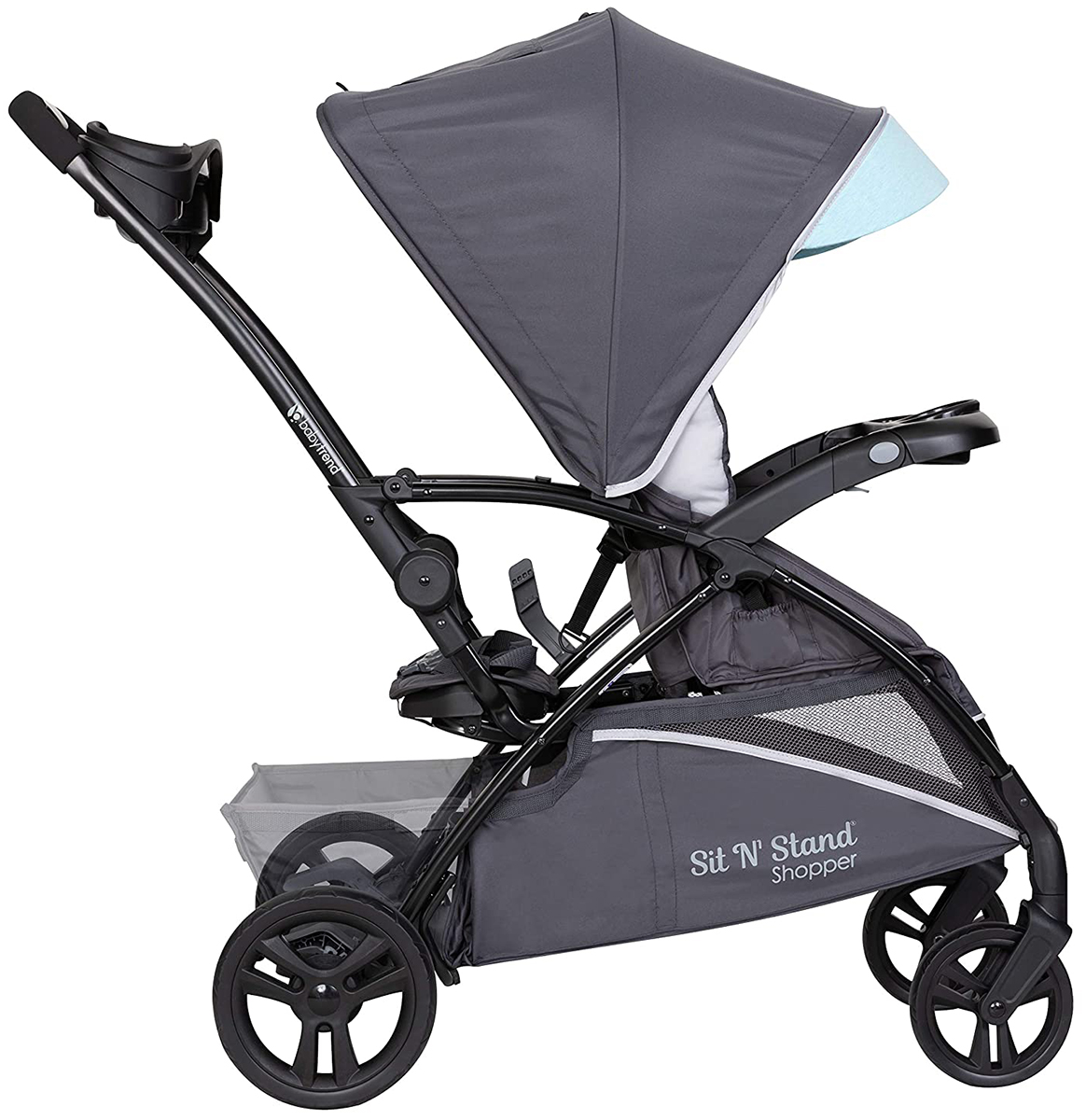 The Baby Trend Sit N' Stand 5-in-1 Shopper Stroller is perfect for your growing family. With the new compact and streamlined frame, our Sit N' Stand 5-in-1 Shopper Stroller has 5 modes of use travel system mode, car seat in the front seat and older child standing on platform, child in the stroller seat only, child in the stroller seat with sibling sitting on bench, and child in the stroller seat with sibling standing. The front and back seats can hold kids up to 50lbs each. Strolling with our Sit N' Stand Shopper Stroller will be a breeze for you and your little ones. Your children will appreciate Comfort Cabin, which includes removable extra-long canopy with UPF 50+ protection, multi-position reclining seat, deluxe fabrics and premium padding that will keep them safe and comfy, staying away from the harmful sun rays. Parents will love our Parent Premiums that have a modern parent console with multi-directional cell phone positioner and extra-deep cup holders. Mom and dad now can easily access the large storage basket in the front and back. With the innovative MagneTec Basket, parents can open and close the basket very quickly with the help of strong magnets to hold the basket closed. This practical extra-large basket can be extended and hold up to 30lbs of parents' essentials groceries, toys, diaper bags, etc. Features 5 modes of use to accommodate your growing family; MagneTec Basket can hold up to 30lbs of parents' key essentials.; Comfort Cabin includes removable extra-long canopy with UPF 50+ protection; Deluxe fabrics and padding provide premium comfort; Modern parent console with multi-directional cell phone positioner and extra-deep flex-grip cup holders; Lightweight frame and streamlined design for easy maneuverability; Super-fast compact and self-standing fold; Accepts Baby Trend Ally, Secure Snap Tech and EZ Flex-Loc infant car seats. (infant car seat sold separately); Recommended Use Front Seat: 6+ months ~ 50 lbs or 40"; Jump Seat/Platform: 2.5+ years ~ 50 lbs or 40";.