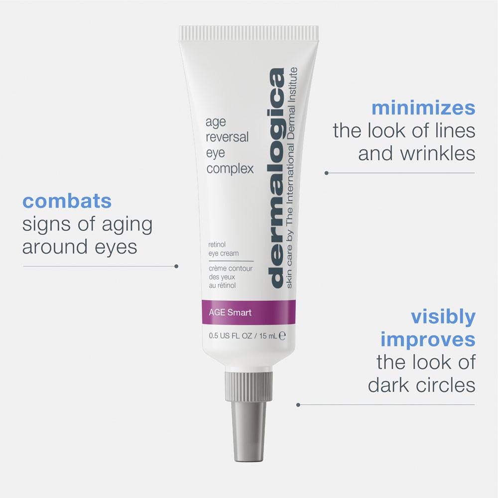 Dermalogica AGE Smart Age Reversal Eye Complex helps to reverse the signs of aging around your eyes. This advanced form of microencapsulated Retinol smooths away aging skin with a potent blend of niacinamide and ash tree bark extract delivering intensive hydration to perk up skin from puffiness and dark circles. A synergy of antioxidant-rich vitamin C powerful peptides and botanical extracts unite to penetrate deep into the skin to turn back the hands of time and defy your age. Benefits: Microsphere Retinol technology reverses eye aging Smooths away wrinkles and fine lines for firmer tighter look Penetrates deep to renew eye-area skin Consult a physician if pregnant or breastfeeding first Not recommended for use within 72 hours of exfoliation or waxing [ 0.5 fl oz / 15 ml ].