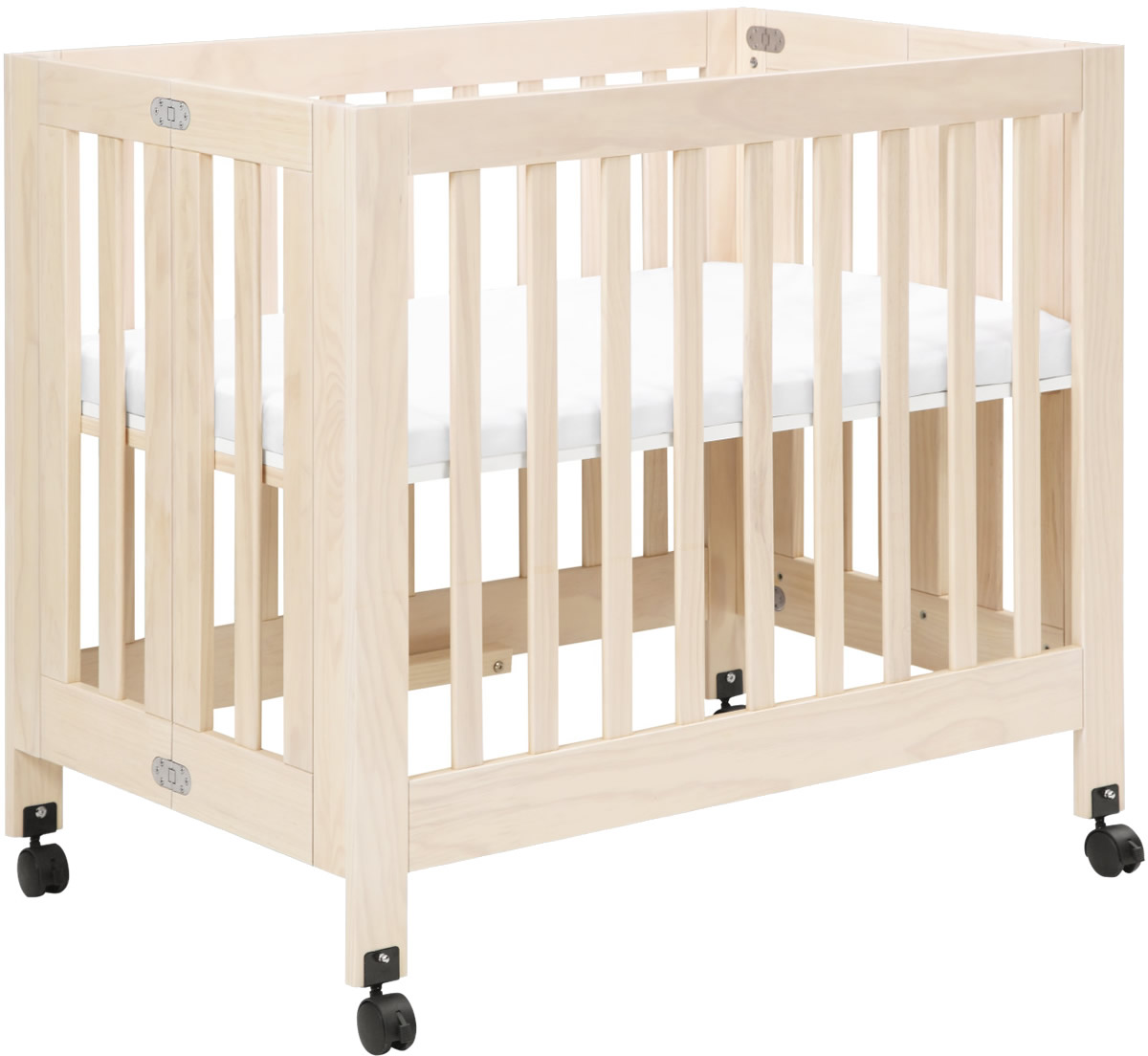 Meet Origami Mini Crib, the portable mini crib designed for modern families. Perfect for urban living or secondary living spaces, the Origami Mini's petite footprint and rolling feet allow for easy movement throughout the home, and will outlast a bassinet, providing a safe sleeping environment for your growing babe. With a folding mechanism for storage, the sustainable wood construction of the Origami Mini is both durable and lightweight. URBAN STYLE AND SIZE: Mini sized for nursery nooks, small spaces, or the grandparent's house. Its geometric lines and clean design are well suited to the modern home.; GREENGUARD GOLD CERTIFIED: The Origami has been tested for over 10,000 chemical emissions and VOCs, undergoing rigorous scientific testing to meet some of the world's most stringent chemical emissions requirements. It contributes to cleaner indoor air, creating a healthier environment for your baby to sleep, play, and grow.; GROWS WITH BABE: A smart alternative to a bassinet and suitable for a growing babe from newborn to beyond 18 months; The low-profile design allows you to easily put a newborn to rest; Features 2 adjustable mattress positions, lower the mattress height as babe learns to sit and stand; Safe to use until 35" tall or starting to climb.; EASY STORAGE: Foldable frame with removable, locking caster wheels for easy storage and transport.; SUSTAINABLE DESIGN: Made with sustainably sourced solid New Zealand pine wood, one of the most renewable woods available; The mattress support is TSCA Compliant engineered wood.; SAFE FOR BABE: Finished in a non-toxic multi-step painting and staining process that is lead and phthalate safe. ; UNIVERSAL MATTRESS FIT: The Origami is a standard mini size crib which includes a 1" mattress pad; We recommend additional support with Pure by babyletto, hypoallergenic, and eco-conscious mini crib mattress (37" x 23.5"). ; Made with sustainable New Zealand pine wood and TSCA Compliant MDF; Specifications: Takes a 37 x 23.875" mattress up to 5" thick; Assembled dimensions: 39.134 x 25.354 x 33.583"; Assembled weight: 62 lbs; Slat strength: 149 lbs; Stop using when child begins to climb or reaches 35";.
