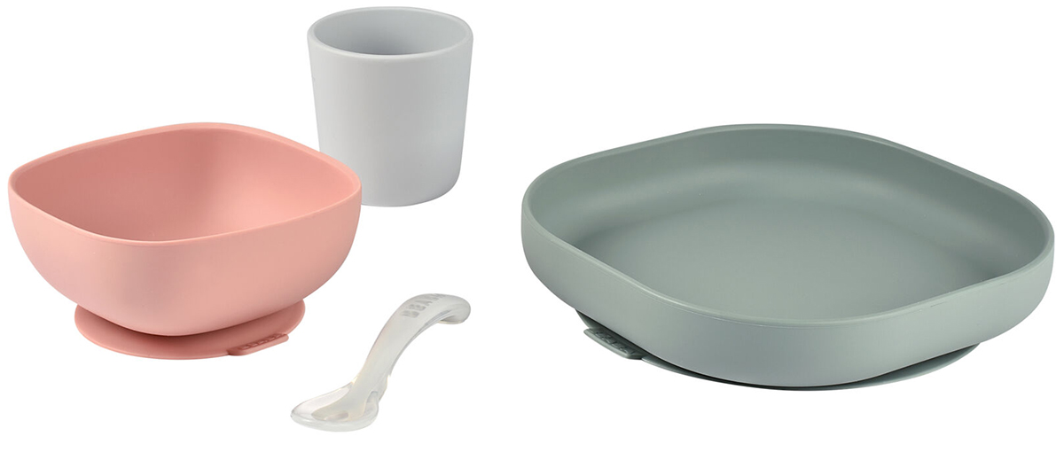 Beaba silicone dish and cutlery set for baby with suction bowl to help toddlers learn how to eat on their own. Silicone meal set range comprising of one plate and one bowl with suction pad, one cup and one silicone 2nd age spoon; Everything baby and parents need for the first meals; Suction pad under the plate and the bowl: to adhere to the table and avoid incidents; Design and ergonomic shape to help guide the scooping of food; Easy to clean and unbreakable; Care: wash by hand or diswasher;.