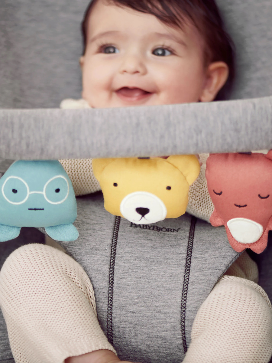A cute and fun toy that your baby will love! Its brightly colored shapes are fascinating for your baby to look at and play with. The toy bar is easy for a grown-up to attach and remove, and fits both Bouncer Balance soft and Bouncer Bliss. Stimulates child development Playing helps your baby to develop and acquire new motor skills. The cute and soft friends on the bar amuse your baby and help to develop and entertain them through play. Fits all baby bouncers from BABYBJ?RN The toy can be used for all baby bouncers from BABYBJ?RN. Soft toy for young babies The soft friends jiggle when the baby moves in the bouncer. Your baby can focus on the large friends in appealing colors and listen to the jingling sound made by a bell. Easy to attach and remove It is easy for an adult to attach and remove the toy bar. When playtime is over, you can easily prepare your baby for naptime by removing the toy bar. Soft and child-friendly materials Our Soft Friends toy bar is made of our very softest jersey fabric and BCI-certified cotton. The fabrics are free from harmful substances and completely safe to taste. Materials Cover for steel bar: 3D Jersey (80% polyester, 16% cotton, 4% elastane); Toys: 100% BCI-certified cotton; Padding: 100% polyester; Washing instructions Machine wash (warm/40 C). Use an eco-friendly, mild and bleach-free detergent. Tested and safe All fabrics are kind to your baby?s skin and safe to taste. Free from health hazardous substances and approved according to OEKO-TEX Standard 100, class I for baby products.