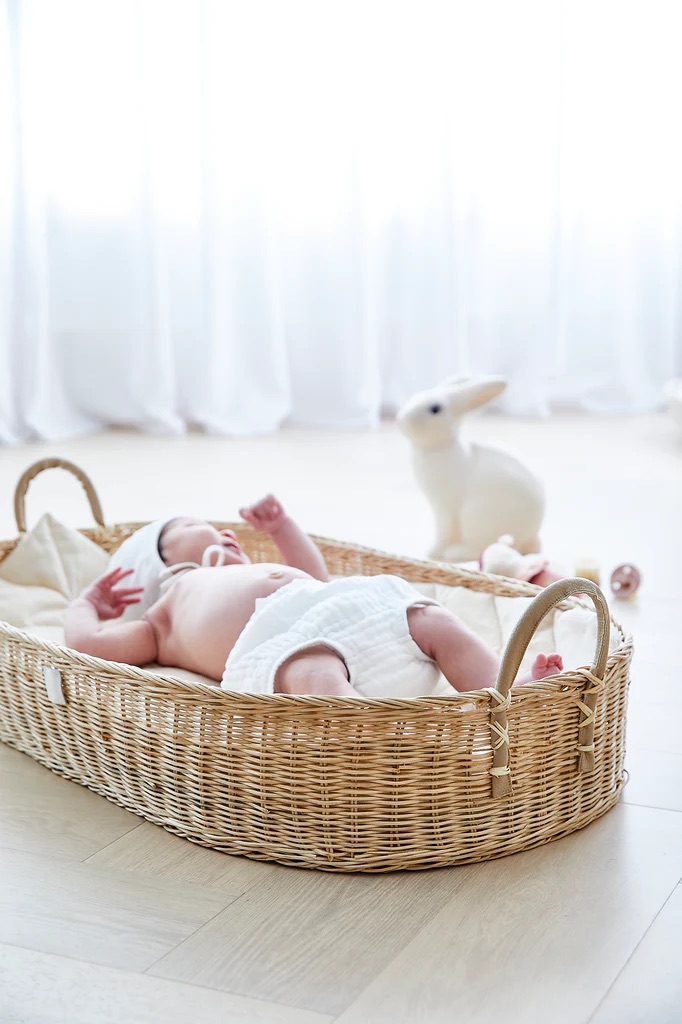 The LUNA changing basket is our newest changing basket addition. It's a unique basket with prestige details. LUNA is made from rattan and designed with safety in mind having generous high sides measuring 5.5 inches that make this a perfect lounging basket and fits most lounging pods. The handles are bendable and soft made in beautiful vegan leather with stunning details. BEBE BASK baskets are an heirloom piece, which can be passed down for generations and they aren't just for babies! Once the diaper days are over, use them as play boats, snuggle baskets for toddlers, crawl level toy storage or pet baskets! Made in 100% premium, eco-friendly & durable rattan ; Memory foam mattress with removable & water-resistant Bamboo Jacquard cover; Luxury leaf liner in cotton ideal for milestone photos; Vegan leather changing mat ; Size: L 31 x W 17.5 x H 5.5 inches. May have slight variations from basket to basket due to their unique hand vowed nature; Weight 2.8 lb (1.3kg); Made by Mamas for Mamas: Our Vietnamese artisan mamas work out of the comfort of their own homes and make our baskets while looking after their small children and running the household. They take pride in the production of our handmade products, and their skill ensures the reliable quality of our brand. When bringing a BEBE BASK piece in to your home, you support local Vietnamese artisans and their families by creating an income and ensuring the continuation of the fine art of craftsmanship. Handmade: Each and every single piece has natural imperfections that create its 'one-of-a-kind' beauty, so you'll never find another just like yours. Variations in color and finish is normal and not considered as faults. Care Instructions: The surface of the natural rattan can easily be wiped with a damp cloth and left to air dry in an open area. Cotton liner and bamboo cover are machine washable. Wipe the changing mat with a damp cloth. IMPORTANT SAFETY INFORMATION: NOT FOR SLEEPING!.