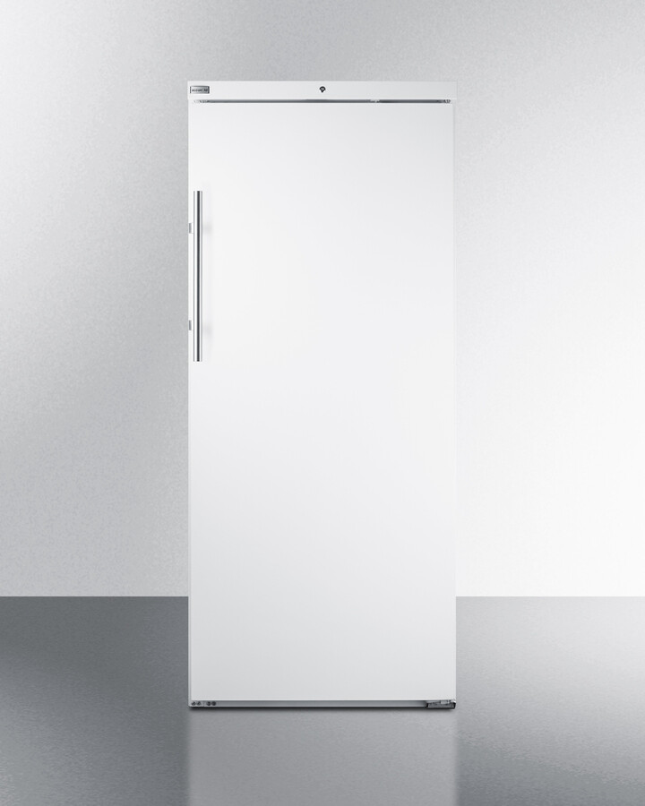 Freestanding Upright Freezer with 18.3 cu. ft. Capacity, 4 Wire Shelves, Manual Defrost, LED Lighting, Reversible Door, Dial Thermostat, and ETL-S Listed. Four heavy-duty shelves are included providing more flexibility in storage. Tight pilaster spacing throughout the interior allows you to adjust the shelf positions to meet your exact storage needs. Static cooling system with no fans or warming cycles. Automatic interior lighting for an efficient presentation. Conveniently located towards the top of the door for easier user access (2 keys included). Extra long power cord with hospital grade 'green dot' plug for a more secure connection. User-reversible door swing for added flexibility to best accommodate your setting. No door storage to allow for the interior to accommodate deeper trays. Preset to -20C with a temperature range of -18 to -24C. Vacuum seal gasket design ensures no cold air escapes (NOTE: Seal activates when door is closed, so you must allow a few minutes to pass before re-opening). Intuitive and reliable mechanical thermostat located inside the unit to prevent unnecessary adjustments. Environmentally friendly design does not contain ozone-damaging chemicals. Eco-friendly hydrocarbon-based refrigerant for a greener footprint that meets current CARB regulations. 18.3 cu. ft. Capacity. ETL-S listed to ANSI-NSF Standard 7 for commercial use. Easy-Grip Brushed Aluminum Handle. Leveling Legs. Capacity: 18.3 cu. ft. Defrost Type: Manual. Door: White. Cabinet: White. Door Swing: RHD. Reversible: Yes. Shelf Type: Wire. Shelf Qty: 4. Adjustable Shelves: Yes. Thermostat Type: Dial. Interior Light: Yes. Refrigerant Type: R290a. Level Legs: 2. Temperature Range: -18 to -24C (Preset to -20C). Amps: 2.7. Voltage/Frequency: 115 V AC/60 Hz. Height of Cabinet: 70 3/4". Width: 30 1/2". Depth: 27". Depth with Handle: 29 3/4". Depth with door at 90: 54 1/8". Interior Height: 64". Interior Width: 25". Interior Depth: 20 7/8". Compressor Step Height: 9 3/8". Compressor Step Width: 25". Compressor Step Depth: 7 1/4". Weight: 215 lbs. Shipping Weight: 230 lbs. Parts & Labor Warranty: 1 Year. Compressor Warranty: 5 Years. US Electrical Safety: ETL. Canadian Electrical Safety: ETL-C. Sanitation: ETL-S. CARB Compliant: Yes. Commercially Listed: ETL-S Listed to ANSI-NSF Standard 7.