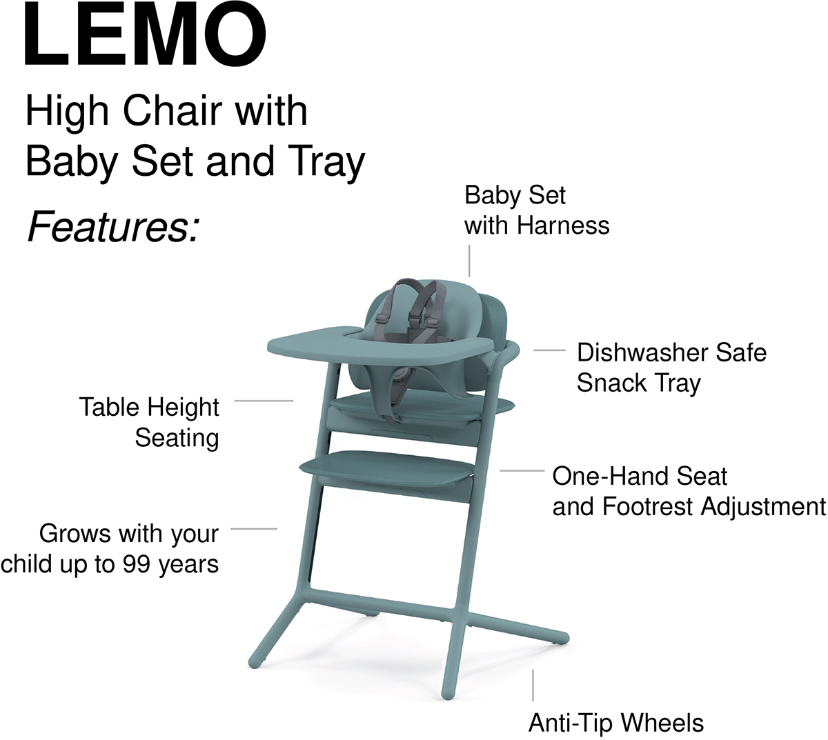 The CYBEX LEMO 3-in-1 High Chair offers a versatile choice that grows with your baby and fits seamlessly into your lifestyle. At 6 months, use the Baby Set and Snack Tray to make mealtime a breeze. As your child grows, remove the accessories to transform the LEMO into an everyday chair that can be used for many years to come. No tools are required and only one hand is needed to make to adjust the chair's height and depth; The Lemo is a timeless furniture piece for ages up to 99 years, with the Bouncer Nest (sold separately) and Baby Set (included) providing support when needed; Featuring an intuitive design with clean and minimalist lines, the Lemo is a long-lasting furniture concept meeting all your child's needs; Numerous depth positions ensure comfortable seating as your child grows; Always the perfect fit: Individual height adjustment allows optimized, ergonomic seating for all ages; Wheels on the rear legs reduce tipping risk and make it easy to move the chair around your home; The Cybex Lemo 2 3-in-1 High Chair includes: Lemo Chair; Lemo Baby Set; Lemo Tray; User Guide; Specifications: Dimensions: 22" L x 21.5" W x 32.1" H; Weight: 16.9 lbs; Suitability: Baby Set: from 6 mos to 3 years; max 33 lbs. Stand-alone chair: from 3 up to 99 years; Seat Height: 1522.5";.
