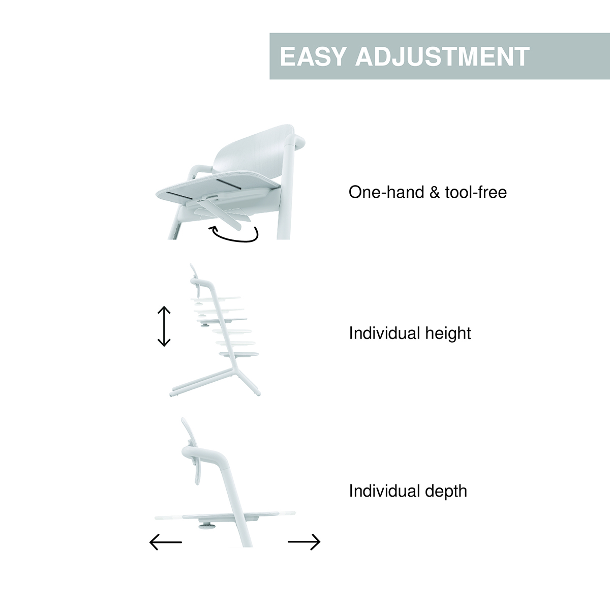 The CYBEX LEMO 2 high chair is a timeless piece that can be used from 3 to 99 years. As your child grows, easily adjust the seat height and depth for a comfortable fit and enjoy for many years to come. No tools are required and only one hand is needed to make to adjust the chair's height and depth; The Lemo is a timeless furniture piece for ages up to 99 years, with the bouncer nest and baby set providing support when needed (accessories not included); Featuring an intuitive design with clean and minimalist lines, the Lemo is a long-lasting furniture concept meeting all your child's needs; Numerous depth positions ensure comfortable seating as your child grows; Always the perfect fit: Individual height adjustment allows optimized, ergonomic seating for all ages; Wheels on the rear legs reduce tipping risk and make it easy to move the chair around your home; The Cybex Lemo 2 High Chair includes: Lemo Chair; User Guide; Specifications: Dimensions: 22" L x 21.5" W x 32.1" H; Weight: 16.9 lbs; Suitability: from 3 up to 99 years; Seat Height: 1522.5";.
